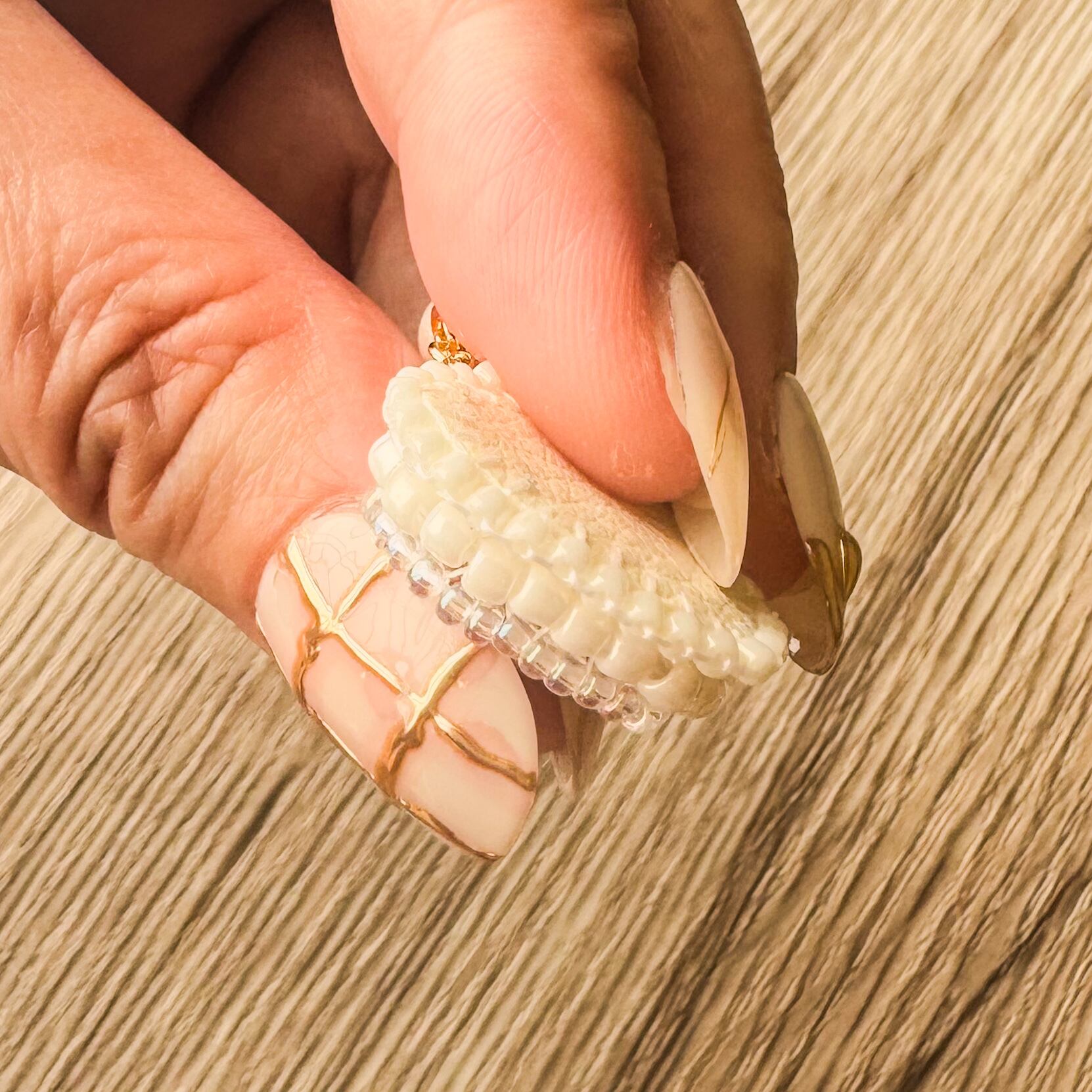 レジン液でカスミソウをぎゅっと閉じ込めてビーズで縁取りました。